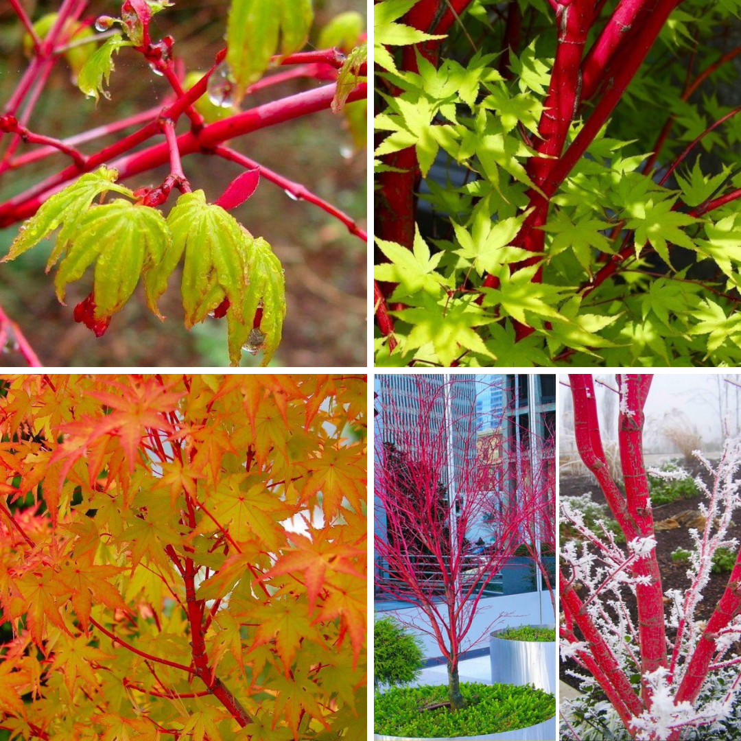 Images show fresh spring foliage bursting from coral-red bark; summer foliage with canary-yellow hues against the bright bark, blazing autumn colour and gorgeous, dogwood like winter bark.