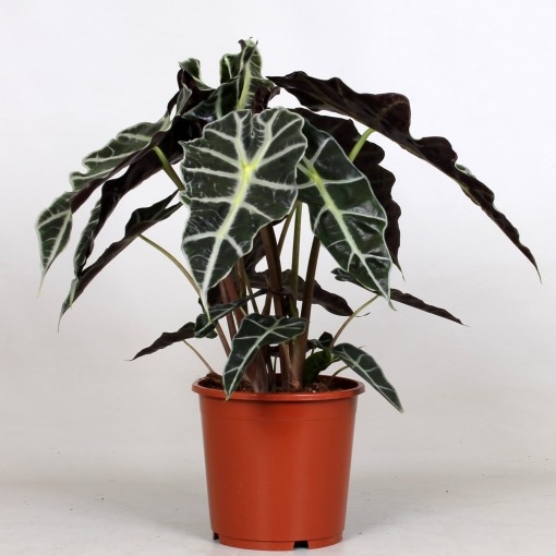 Alocasia Polly is a striking plant with deep blue-green leaves and contrasting white veins. The leaves have an interesting wavy shape making them unique. This is a great plant to add some diversity to your houseplant collection or to use as a focal point in a room. It is quite a compact Alocasia so works well in smaller spaces.
