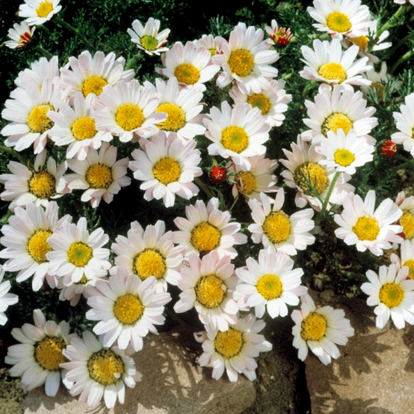 Anacyclus pyrethrum depressus, also known as the Mount Atlas Daisy, is a charming low-growing perennial perfect for rock gardens, gravel beds, and sunny borders. Its dainty, daisy-like flowers feature white petals with striking red undersides, giving a vibrant two-tone effect as they open in the sun and close in cooler temperatures.