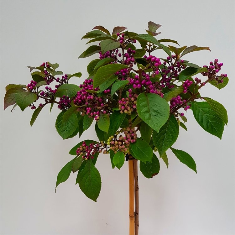 Nothing can rival the vivid colouration of the beauty berries fruits in Autumn, an eye catching bright shade of purple, and here for the first time we present this lovely plant in the unusual form of a lollipop standard tree with a clear stem of around 120cms tall and total height of around 150cms, they would perhaps suit a patio planter or could be used dotted around beds and borders to make a real statement.