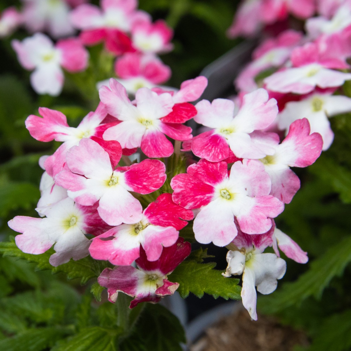 The striking and eye-catching Cascading Verbena Lanai Red Twister plant has unusual red flowers with white swirls that form a captivating pattern reminiscent of a twister. This eye-catching plant is ideal for giving hanging baskets, window boxes, and patio planters a pop of vibrant colour and visual intrigue. It gracefully cascades, offering a never-ending show of flowers from early spring until October.