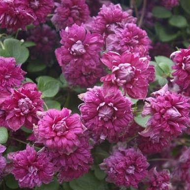 This is an amazing Clematis variety with masses of sumptuous, double, reddish-purple flowers from mid-summer to late autumn. Easy to grow and vigorous, Purpurea plena Elegans is a late flowering clematis that makes an excellent partner for climbing through a climbing rose, shrub or tree in full sun or partial shade.