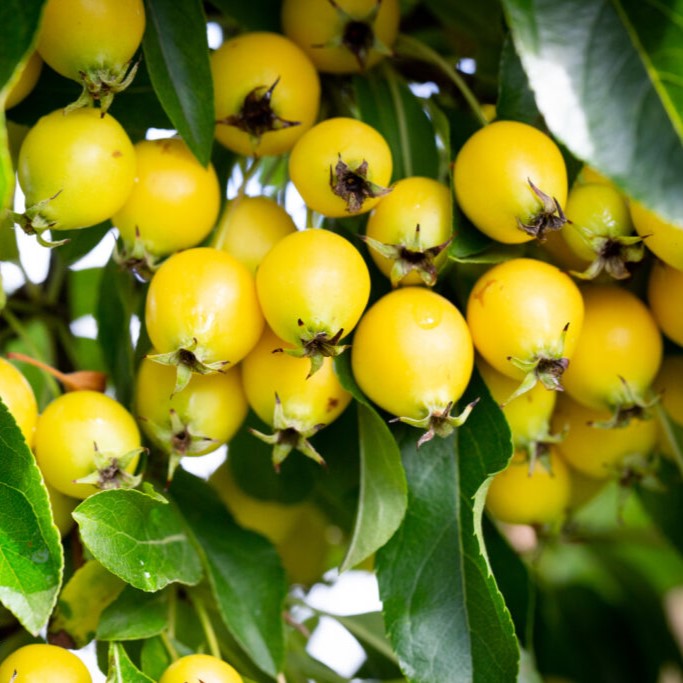 Malus ‘Comtesse de Paris’ is an elegant and reliable ornamental crabapple, celebrated for its profusion of golden-yellow fruits that glow in autumn and persist well into winter. In spring, it offers a cloud of soft white blossom that attracts bees and pollinators, while its dark green foliage turns warm shades in autumn. Its tidy, rounded habit makes it perfect for borders, lawns, or wildlife-friendly planting. Comtesse de Paris is hardy, easy to care for, and resistant to common crabapple diseases. Prune lightly in late winter to maintain a neat shape and remove dead or crossing branches. Combine with Malus ‘Golden Hornet’ or Cornus alba for striking contrast and year-round interest.