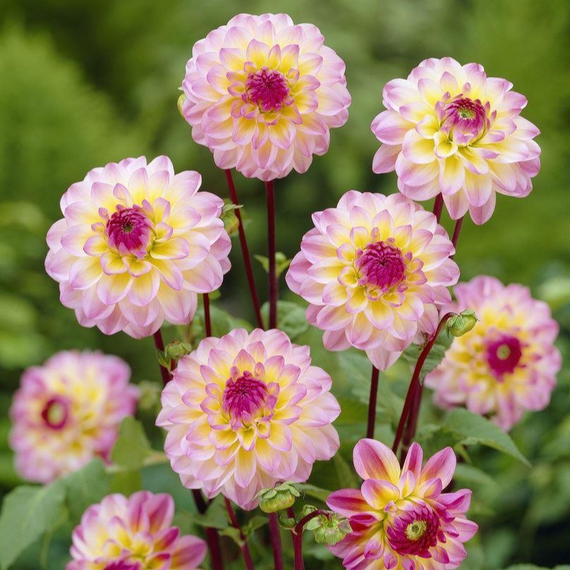 Dahlia ‘El Paso’ is a beautifully formed ball dahlia with perfectly rounded blooms in soft shades of blush pink, creamy yellow, and deeper rose at the centre. Each flower is tightly packed with neatly rolled petals that create a symmetrical, honeycomb-like structure, giving the plant a refined and elegant appearance. The blooms are carried on strong stems, making them excellent for cutting and long-lasting in floral arrangements. Flowering from midsummer through to the first frosts, ‘El Paso’ adds gentle warmth and colour to borders, cottage gardens, and dedicated cutting gardens.