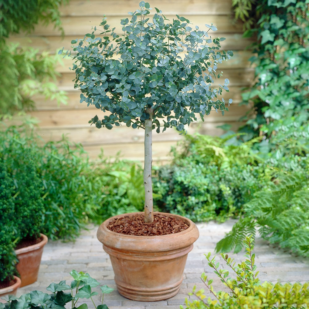 The evergreen lollipop standard Eucalyptus tree has extremely decorative silver-blue oval shaped foliage and flaking bark in shades of grey, cream and brown. Well known for the insect repelling qualities thanks to a pleasant menthol aroma, particularly when trained and regularly clipped in to the standard form such as this. If gnats and mosquitoes are causing you bother on the patio, this decorative Eucalyptus standard is ideal for patio planters or simply grow in garden borders.