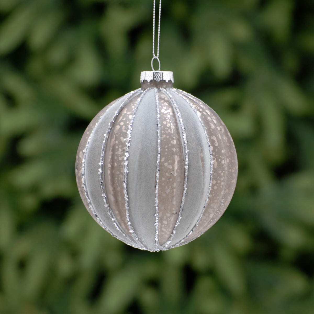 Flocked Grey Segment Glass Bauble – Christmas Tree Decoration