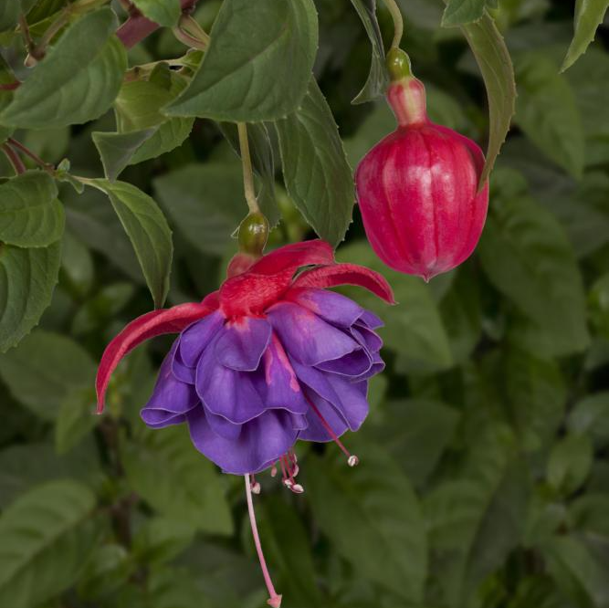 Known for its huge, magnificent double flowers with a gorgeous arrangement of pale pink petals gently contrasted with a deep purple corolla, the fuchsia ‘Gillian Anthea’ is a wonderful variety. With its trailing branches and profuse blooms that drape gracefully, this attractive plant is perfect for hanging baskets and containers. It provides a visual feast from early summer until the first frost.