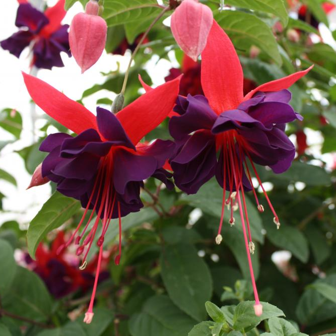 The beautiful Fuchsia ‘Maori Maid’ cultivar is well known for its exquisitely distinctive flowers. This plant produces a stunning display of lovely double blooms with vivid red sepals and deep purple skirts that hang gently from the branches. It’s a common option for garden beds, hanging baskets, and containers where the cascading flowers may be observed up close.