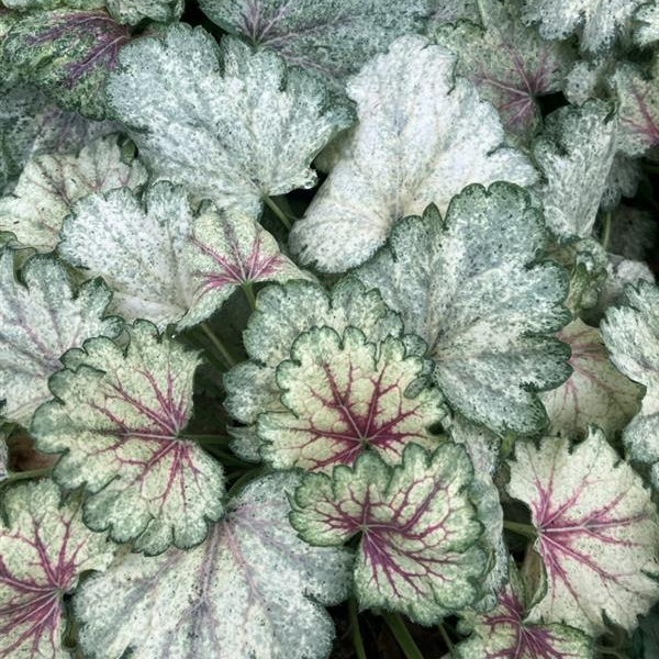 Add a splash of quirky colour and texture to your garden with Heuchera ‘Snowy Panky’, a striking variety of Coral Bells known for its unique, frosted foliage. Its scalloped leaves blend deep burgundy with silvery-white marbling and soft green edging, creating year-round interest even when not in flower. In late spring to early summer, slender stems rise above the foliage, topped with dainty pinkish-white blooms that attract pollinators.