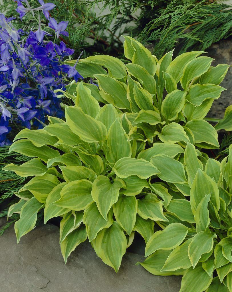 One of the best newer hostas and an award winner, this is a fast-growing small-medium cultivar. Small, heart-shaped leaves in mid-green are nicely highlighted by a golden-yellow margin. Purple striped flowers. Supplied in approx. 1 litre containers.