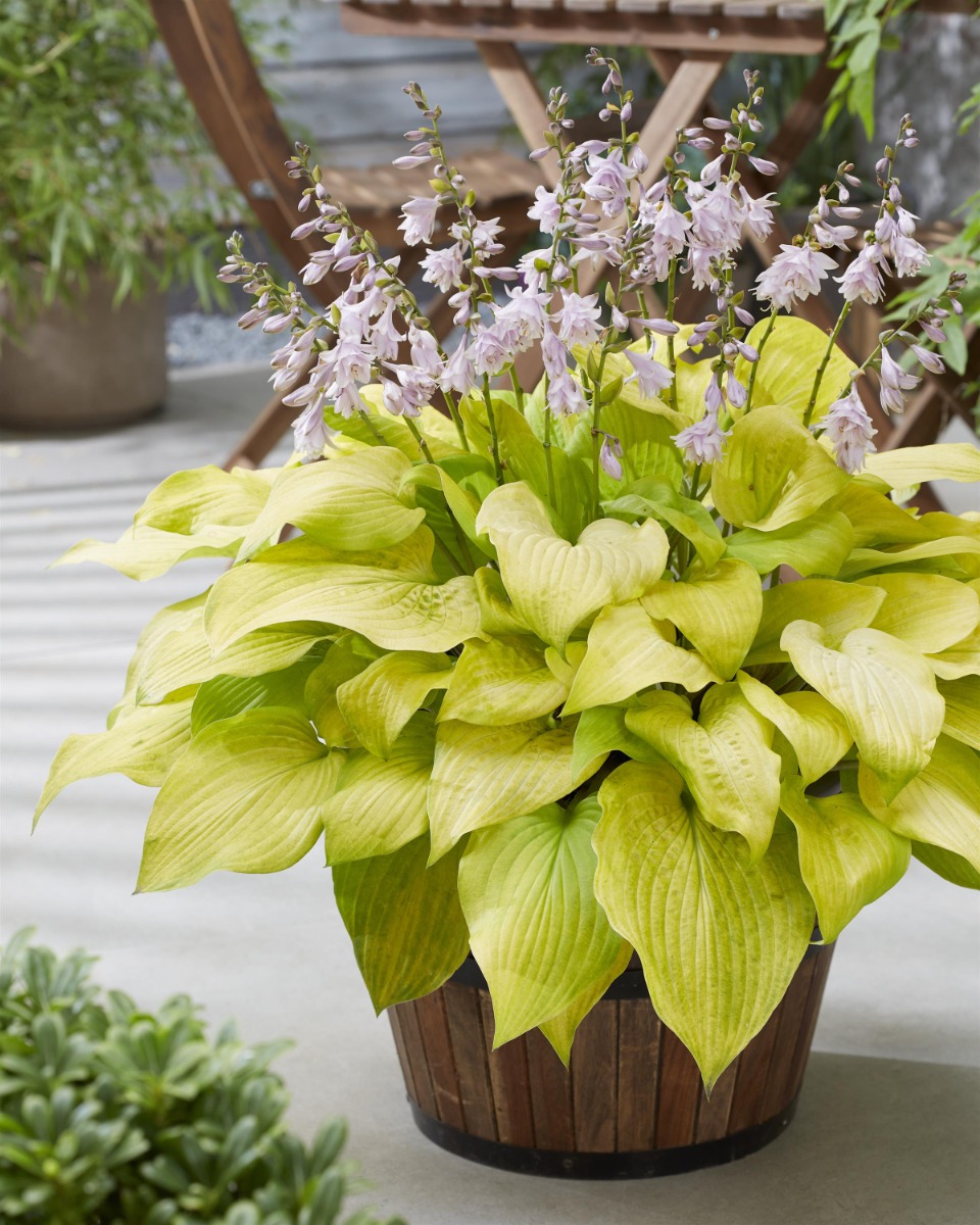 Hosta ‘Ki Ren Jyaku’ is a delightful, shade-loving beauty with real charm! Its glowing golden-yellow leaves from a full, elegant mound, bringing a fresh splash of colour to darker corners. In summer, it sends up soft lavender blooms, adding a gentle, airy touch above the foliage. A superb choice for brightening borders with effortless style
