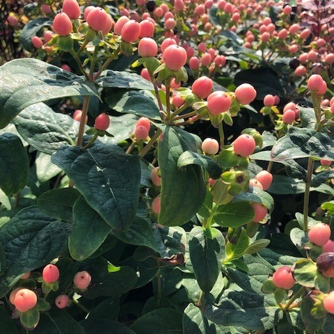 This semi evergreen shrub, which is fully hardy, bears dark green oblong leaves, and profuse yellow flowers in early and mid summer, followed by masses of berries in shades of peach,pink and yellow. These eye-catching berries stay on the plant before eventually turning black in late Autumn. Very easy to grow, these are great for seasonal interest for long periods – both summer flowers and autumn fruiting. They also make for superb groudcover.