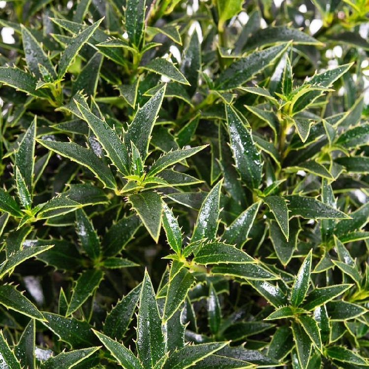 More commonly known as the Prickly Pineapple Holly, Ilex myrtifolia is a compact variety with dusky young purple shoots and thin, slender dark green leaves edged by fine, moderately soft spines. Myrtifolia holly is a very unusual male variety of common holly, compact and slow growing, and will therefore be an ideal pollinating partner for the varieties that bear berries in your garden. With its deep green, small, super glossy leaves, it can be celebrated as a close topiary, or tucked in a corner in the background to help with the production of berries with any female hollies in the locality out of prominent view but functional.