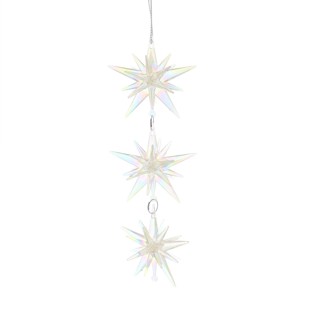 This starburst drop is sure to add a unique element to your festive themes this Christmas. Featuring three connected starbursts, each with an iridescent finish, it catches the light amazingly to create a magical, rainbow glow.