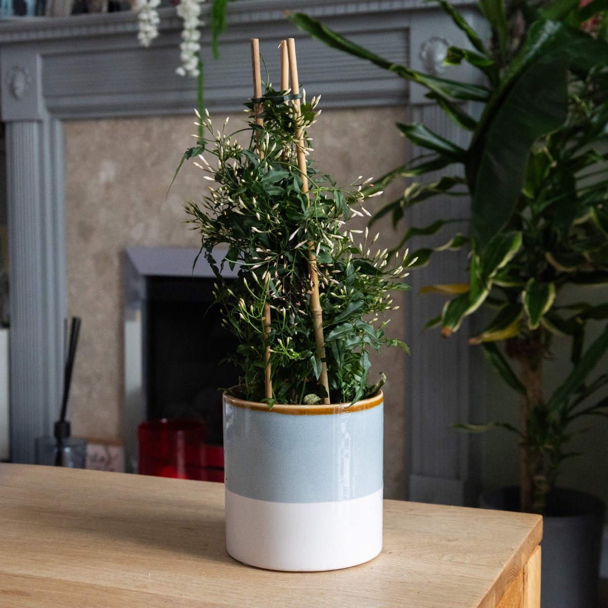 Bursting into masses of highly fragrant star-shaped, white flowers, Jasminum polyanthum fills spaces with sweet perfume and elegant beauty. This fast-growing climber produces clusters of blush-pink buds that open into pure white blooms, creating a striking contrast against its rich green foliage. At 40cm tall, it offers immediate impact, making it perfect for tabletops, windowsills, or as the beginning of a stunning climbing display.