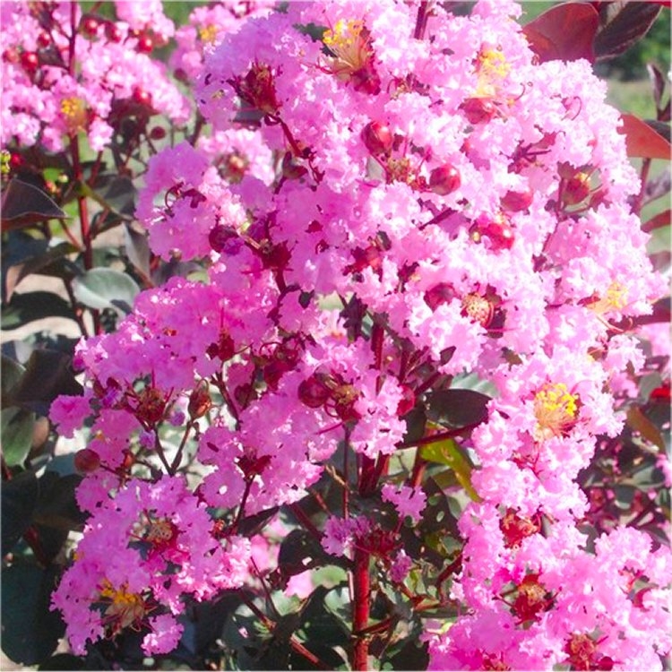 Rhapsody in Pink has sensational wine purple new leaves that age to dark green, and is smothered in soft pink flowers for long periods from June to September. Gold-orange foliage in Autumn adds yet more seasonal interest to this magnificent Crepe Myrtle. It will form a good sized shrub or small tree in a sunny spot, or is also ideal for large pots.