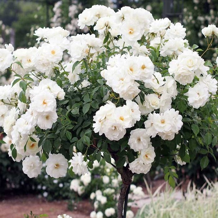Standard Edelweiss Weeping Rose will produce masses cascading branches, over time, taking the form of the well know weeping Kilmarnock Willow, but of course, these are Roses! Each tree boasts an exquisite cascade of crisp white blooms. The distinctive standard form of this rose is achieved by deliberately grafting them onto a tall stem. The high, arching branches are densely packed with flowers, which bloom from early summer until autumn. They provide height and visual flair to any outdoor space, making them perfect for framing doorways, bordering garden walkways, or serving as a dramatic centrepiece in a container.