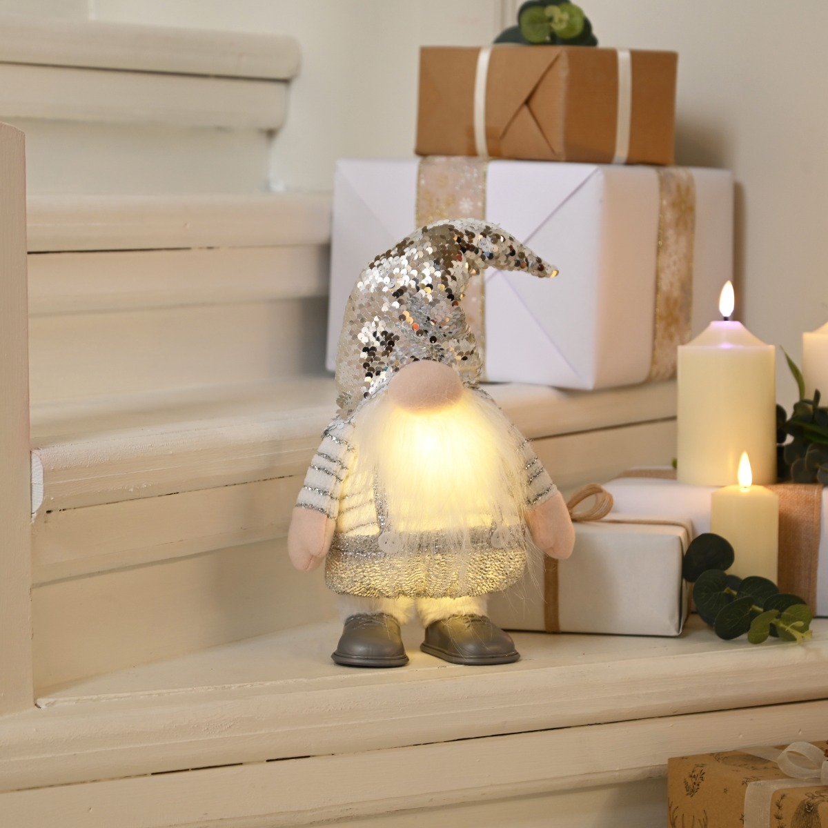 Add sparkle to your Christmas décor with this LED musical dancing gonk. Dressed in shimmering silver sequins, with a matching hat, this adorable gonk will add a joyous, dynamic element to your Christmas decorations.