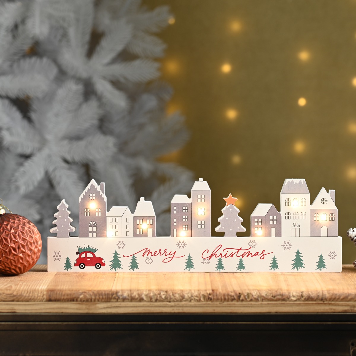 Bring a cosy, festive glow to your home with this LED wooden village. Beautifully crafted, this decoration features a charming row of snow-topped houses, Christmas trees, and a red car carrying a festive tree, all illuminated by warm white LED lights for a soft seasonal ambience.