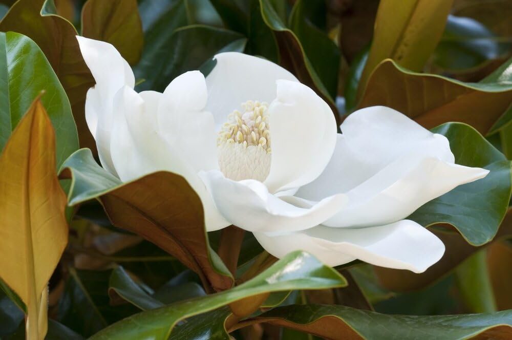Magnolia grandiflora ‘Kay Parris’, renowned for its exceptionally flossy foliage and richly coloured undersides, offers year-round structure and an added touch of warmth. This beautiful evergreen forms creamy-white, fragrant flowers through summer/autumn, perfectly suited as a specimen tree, structured border feature, or an attractive screening plant.