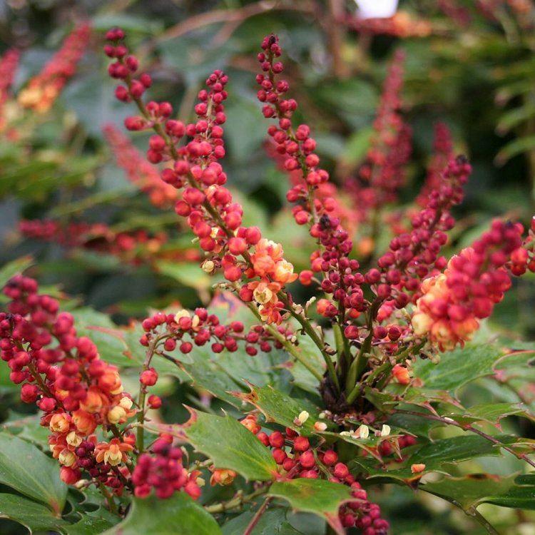 These brightly coloured blooms appear initially as elegant racemes smothered with vividly coloured orange-red buds that open from the base of the spike to reveal cheerful yellow flowers. Once the flowers have faded bluish-grey berries form which contrast beautifully with the winter foliage. This really is an amazing new colour introduction to the Mahonia range.