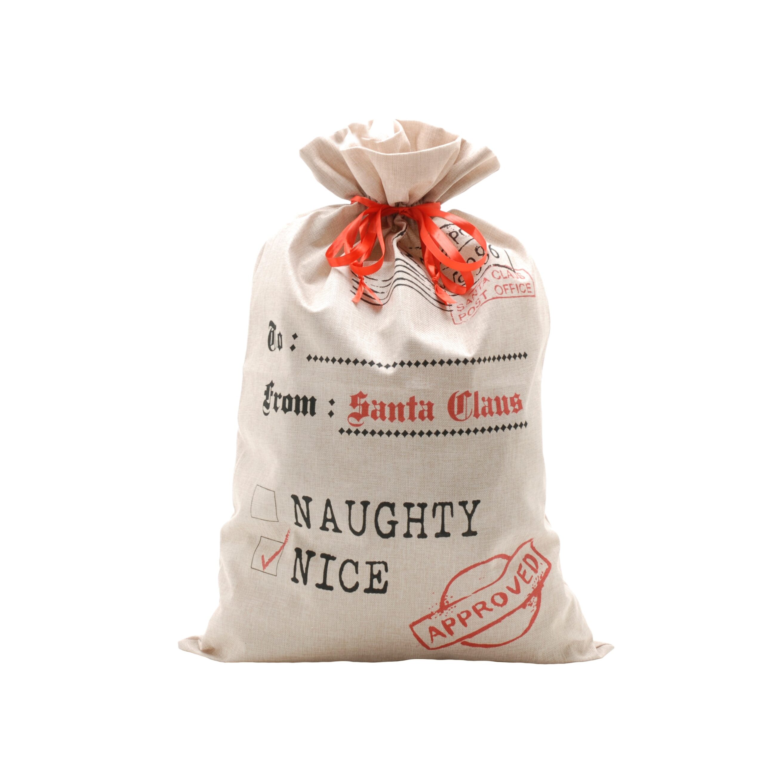 Deliver gifts in style with this matural colour hessian Christmas sack featuring a fun Naughty or Nice checklist, complete with a drawstring. This is a good gift for anyone hopeful of a present or two from santa, or can simply be used as decoration.