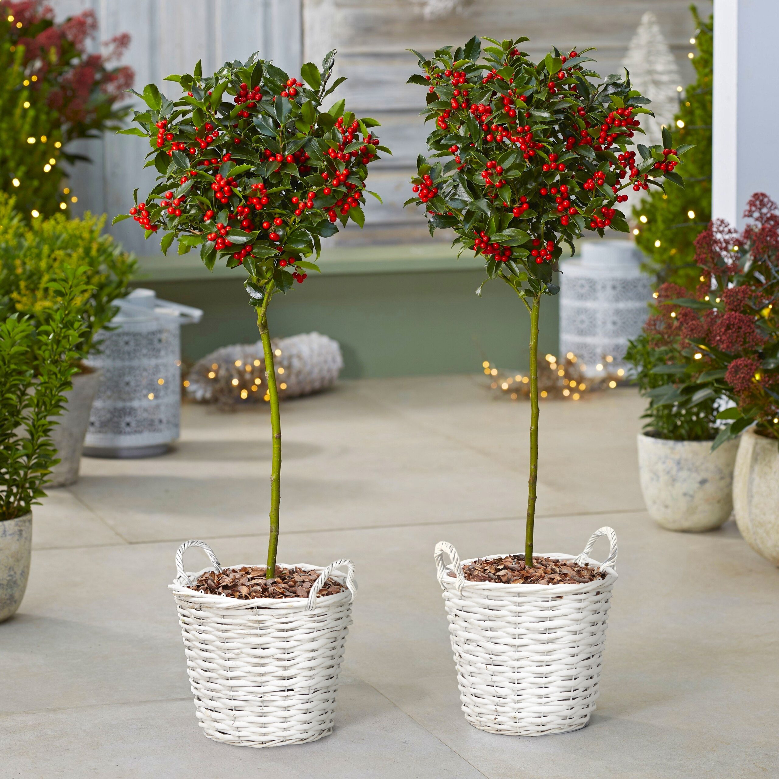 Beautiful Festive Holly Tree Standards, covered in masses of real berries and supplied complete with decorative grey-white baskets.