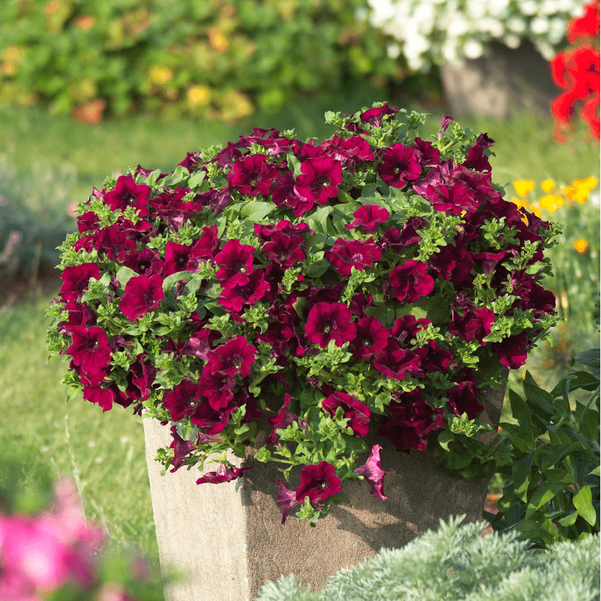 With its strong visual effect and deep burgundy blossoms, this Petunia Surfinia® really makes an impression. This vigorous trailing cultivar is perfect for people who want to give their outdoor settings a pop of vibrant colour. It produces a profusion of huge flowers from early summer until the first frost, making it perfect for hanging baskets, window boxes, or flowing over the sides of patio planters.
