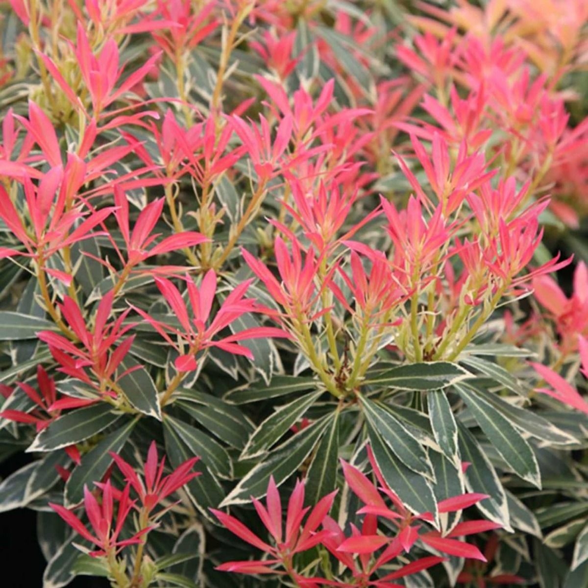 Pieris japonica Flaming Silver is lovely evergreen form of the ‘Lily of the Valley’ Shrub, so called due to the appearance of masses of white bell shaped flowers that hang off of small tassel-like stems in late Spring, covering the shrub in an attractive display – but this is not all! Flaming Silver has beautiful silver variegated foliage, with each leave margined in silvery-white, the flame element describe the new foliage which emerges as a bright flame red – a real show stopper.