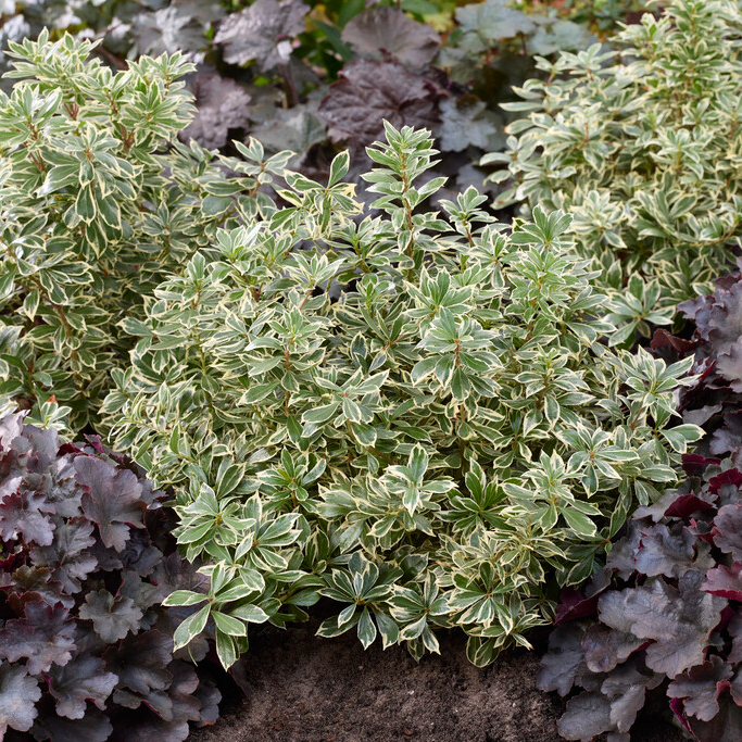 Pieris japonica ‘Little Frosty’ is a beautifully compact, evergreen shrub known for its variegated foliage and delicate spring blooms. Its small, glossy green leaves are edged in creamy-white, creating an elegant, frosted effect that provides year-round interest. In early spring, cascading clusters of bell-shaped, creamy-white flowers appear, resembling lily-of-the-valley, attracting early pollinators. This slow-growing variety is perfect for small gardens, patio containers, or woodland borders, where its neat form and striking foliage add texture and colour.