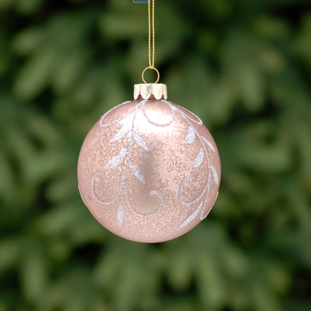 A stunning bauble to take the hassle out of the Christmas season. This leaf bauble is crafted from delicate glass, featuring a soft pink base adorned with silver glitter leaf designs.