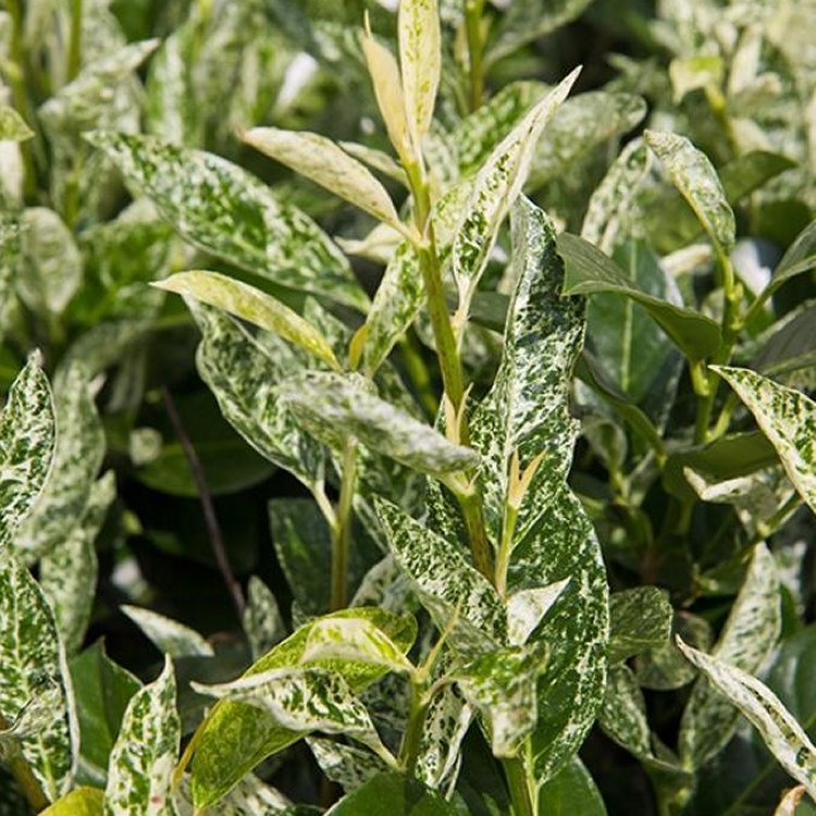 Prunus laurocerasus ‘Ivory’ is a fantastic new variegated cherry laurel with striking brilliant white to cream marbled foliage.