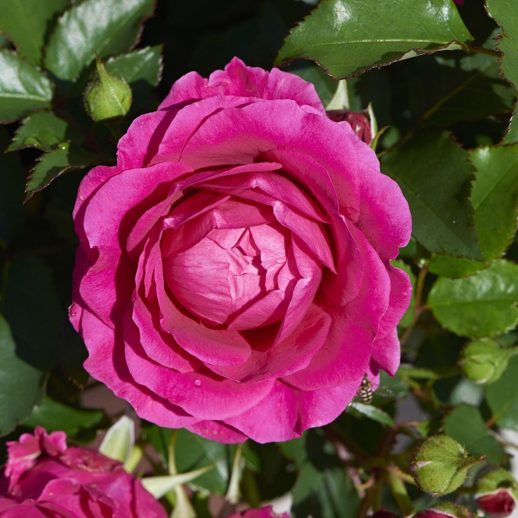 The Rose ‘Palace Ajnda’ is a compact patio shrub rose with numerous, double, deep pink blooms from late spring to autumn. Its bushy growth habit grows to a height of 20-40 cm, making it perfect for small gardens, pots, and as a border plant. The vivid blossoms stand out against the dark, glossy foliage.