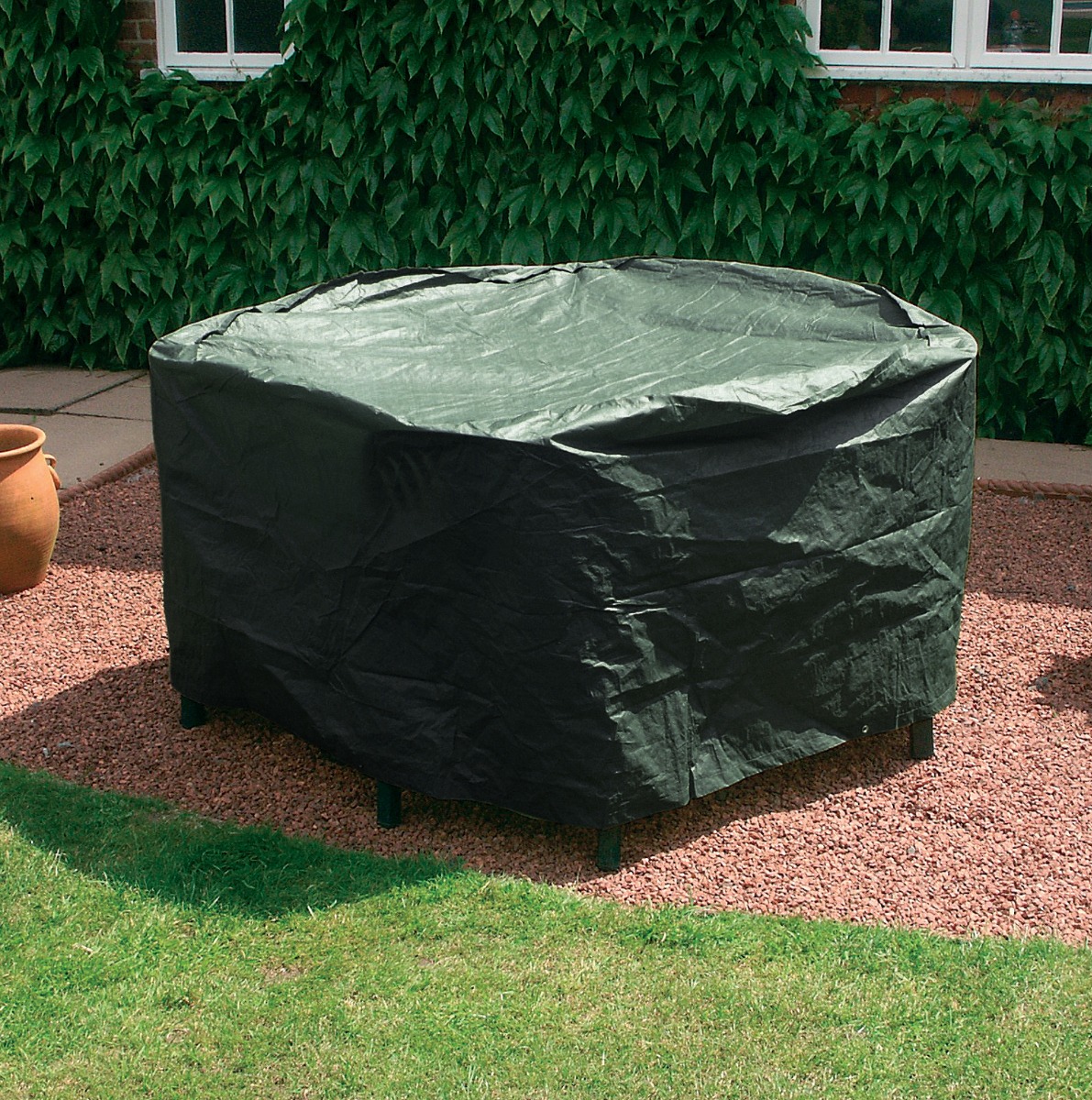 Use the Patio Set Cover to protect your patio set. This cover provides strong weather protection because it is made of durable, waterproof woven polyethylene (PE) fabric that has been UV treated. With its tie-down cord, it guarantees a tight fit for 5-piece patio sets that are round or rectangular, protecting them from the sun, rain, and dust.