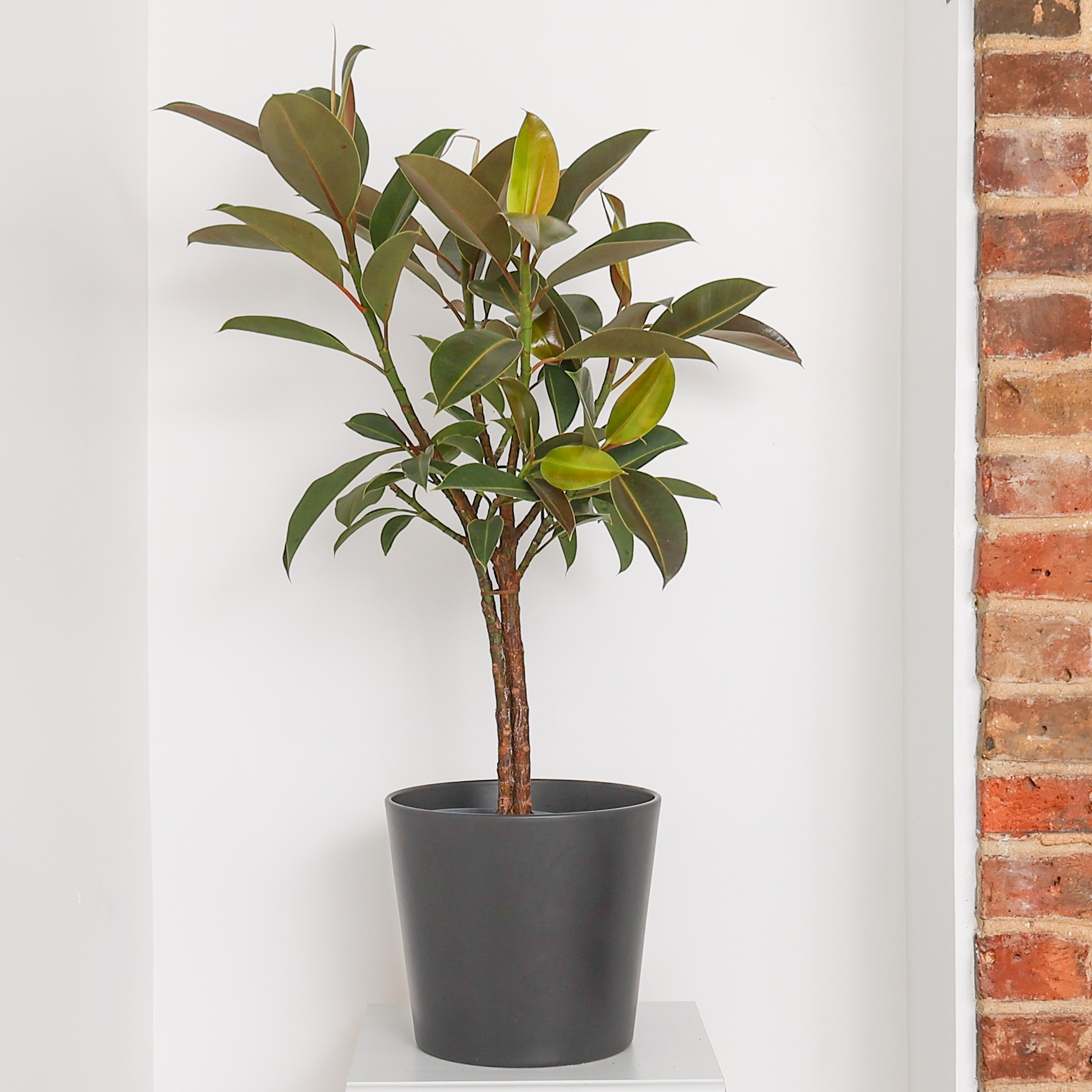 Keep Ficus elastica Melany somewhere where it will receive bright, indirect light – direct light can burn the leaves. It will also tolerate lower light conditions. Make sure to keep the soil slightly moist, watering when the top layer of soil has dried out.