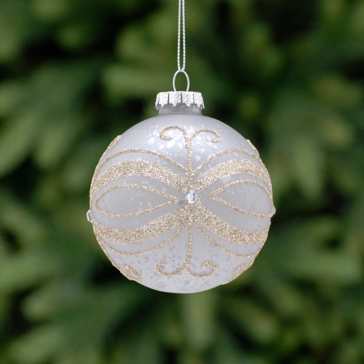 This silver and gold bauble is a sophisticated decoration that will add timeless elegance to any festive display. Crafted from delicate glass, its soft silver background, gold glitter lines, and sparkling gem details boast an intricate and radiant charm.