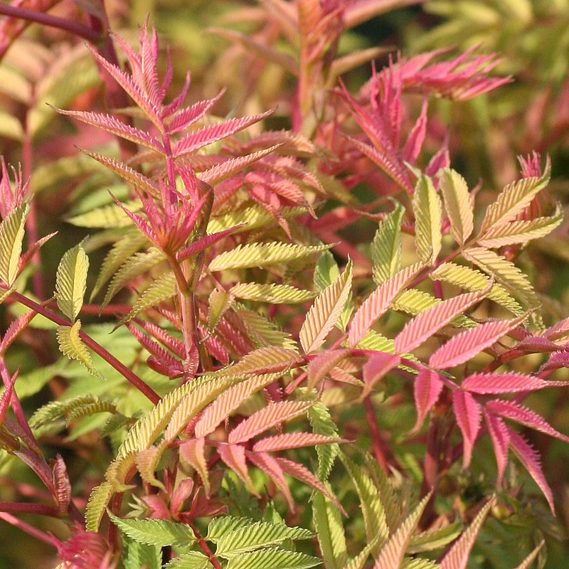 A new and unusual, compact hardy shrub with bronze coloured young pointed leaves of frond-like appearance and fingers of white flowers. Equally happy in small groups, alone in a border or in a pot on the patio. Reaches just 1 metre tall, creating nice foliage structure. Supplied in approx 5 litre containers.