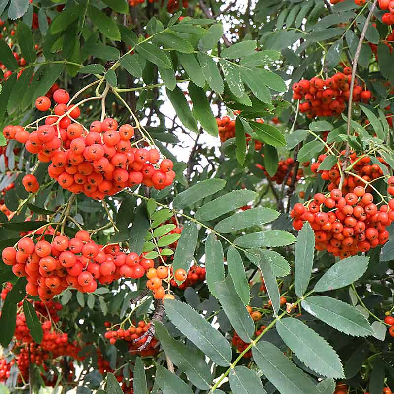 Sorbus aucuparia ‘Sheerwater Seedling’ is a neat and upright native rowan that is ideal for urban gardens, avenues, and compact areas. It produces clusters of creamy-white flowers in the spring, which attract pollinators, and brilliant orange-red berries in the late summer, which are very enticing to birds. Its thin, pinnate green leaves become blazing colours of orange and scarlet in the autumn, offering interest throughout the season.