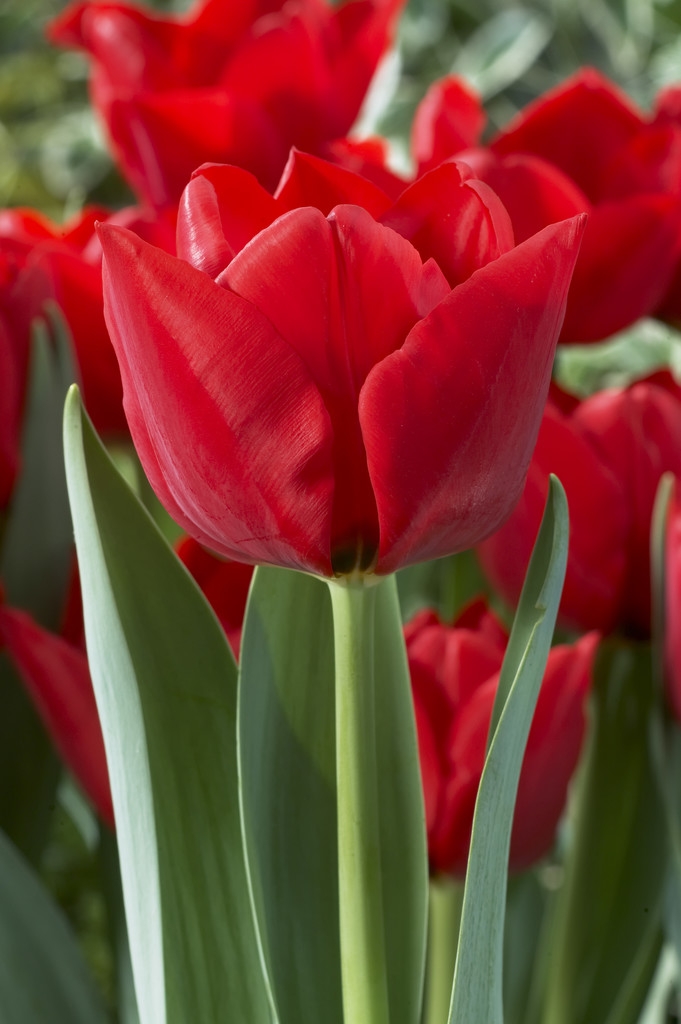 The popular red tulip that is a highlight in any garden is Ben van Zanten. In mid spring, its vivid red blooms shine like a gem.