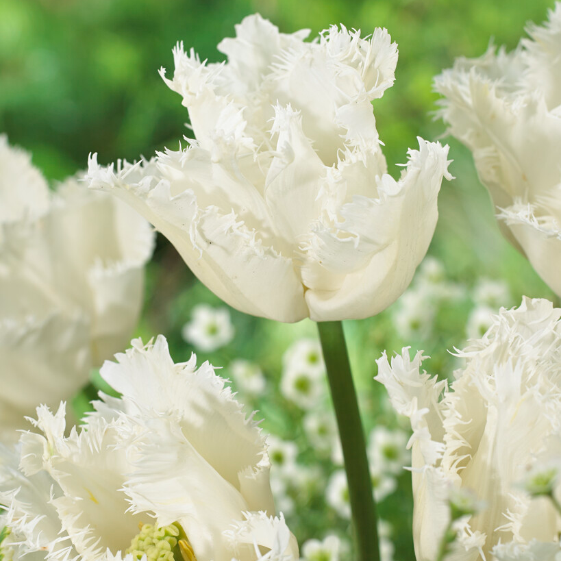 Tulip ‘Smirnoff’ is a stunning variety that brings a touch of sophistication to any spring garden. Its pure white, goblet-shaped blooms stand tall on sturdy, green stems, creating a striking display of freshness and light. Blooming in mid to late spring, these tulips add a touch of elegance to borders, flowerbeds, and containers. The crisp, pristine flowers contrast beautifully against lush green foliage, making them a perfect choice for modern, minimalist garden designs.