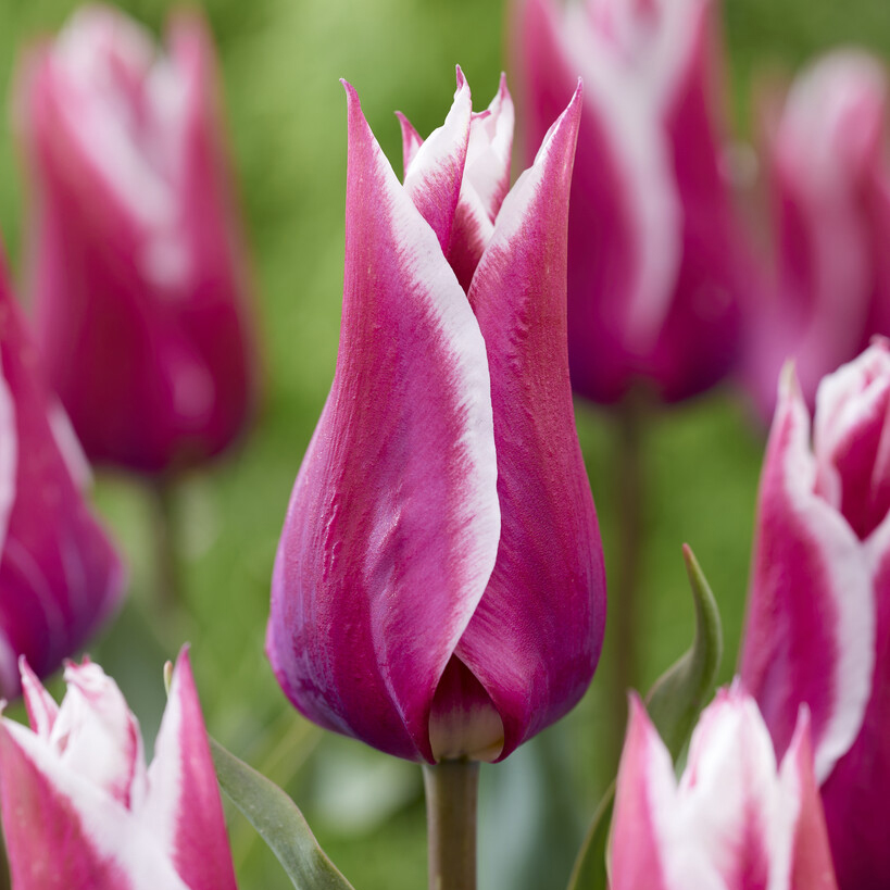 Elegant and eye-catching, the Tulipa ‘Claudia’ is a classic lily-flowered tulip that adds flair to spring borders and containers. Its pointed petals open softly to show a magenta-purple hue edged delicately in white, creating a beautiful contrast that comes alive in the sunlight. With its tall stems, Claudia adds movement and height to any spring display and is an excellent cut flower.