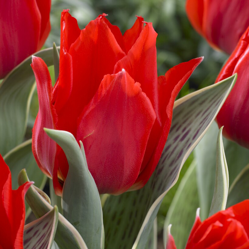 Tulipa Rob Verlinden is a charming Greigii Tulip that is prized for its gorgeously patterned leaves and early spring flowers. Each robust stem contains a scarlet-red blossom, and the mottled leaves add interest even before the flowers appear. This reliable and compact tulip adds brilliant colour to the garden during spring and is ideal for borders, rockeries, or containers.