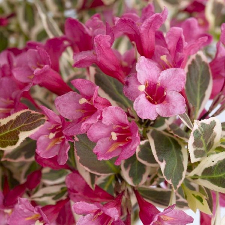 Make an impression with this colourfully variegated dwarf Weigela Monet. Creamy edged leaves are infused with various shades of pink. Masses of funnel-shaped, pale pink flowers appear on graceful arching stems in late spring and early summer. This colourful plant is very hardy and easy to grow, although it prefers fertile, well-drained soil it will thrive almost anywhere.