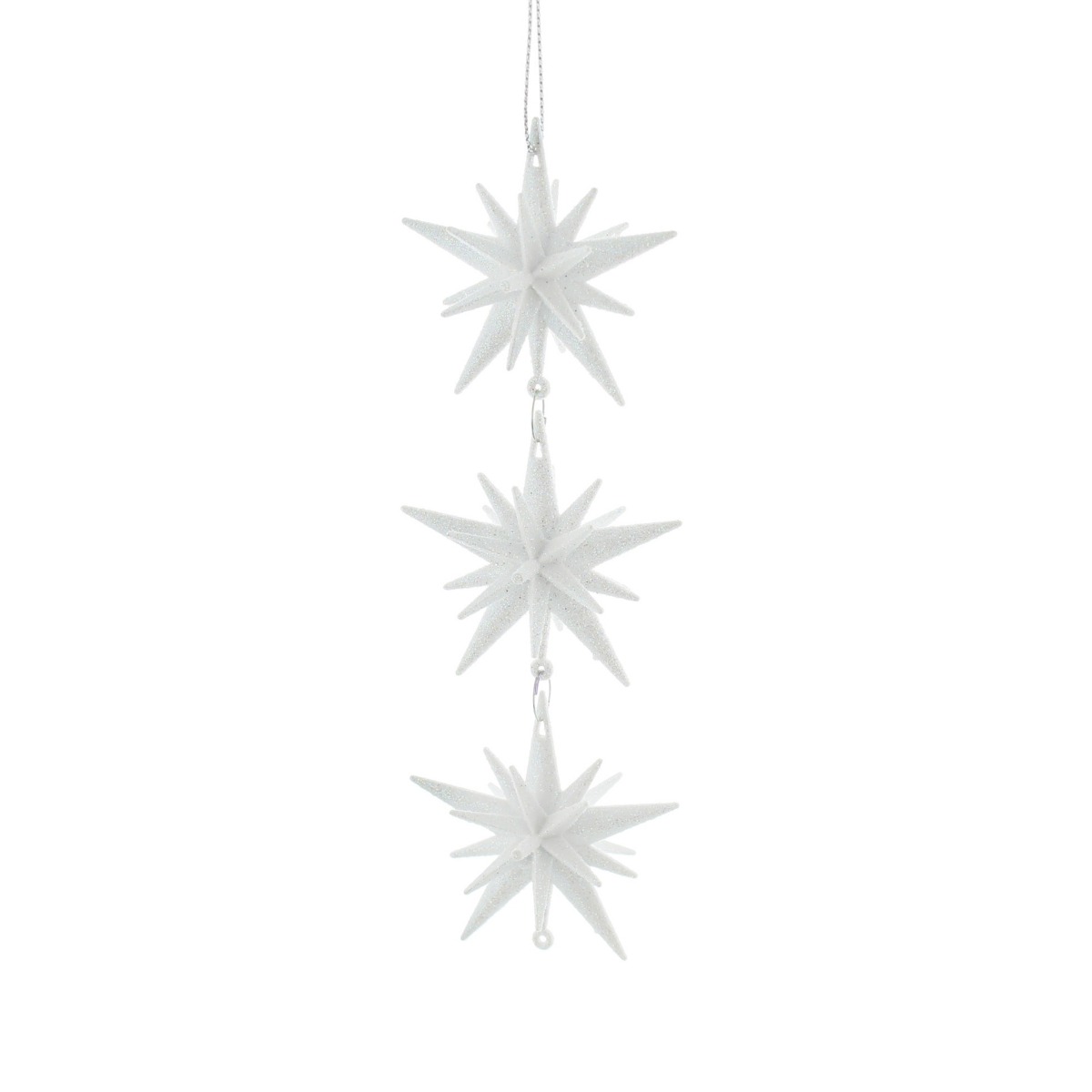 This white starburst drop is perfect for your Christmas displays if you desire to add a sense of elegance. The three starbursts, connected by small links, create a cascading effect. The glitter finish gives it a sparkling appearance, adding shimmer to your Christmas trees, wreaths, and garlands.